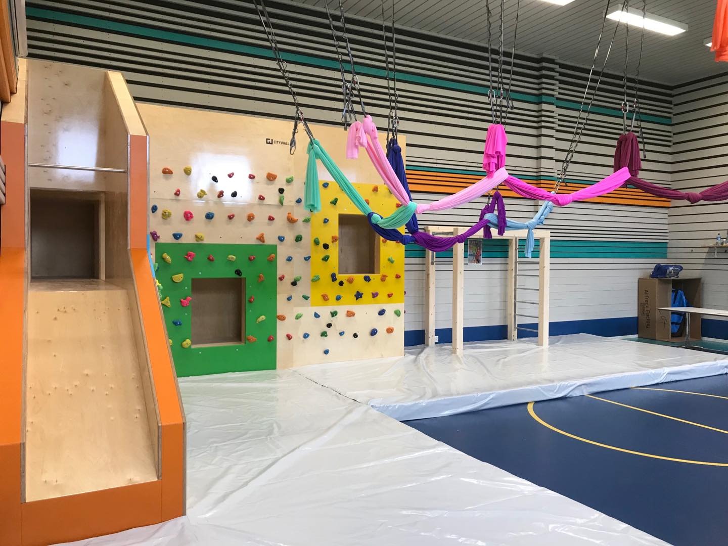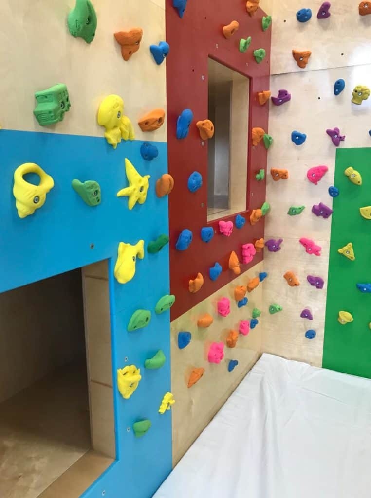 Innendørs designet vi en klatrevegg med innebygget labyrint, denne er laget spesielt på mål for at den skal passe perfekt i rommet. Med rutsjebane og monkeybar er dette en stor favoritt hos barna. Madrassen er og laget spesielt for dette prosjektet.