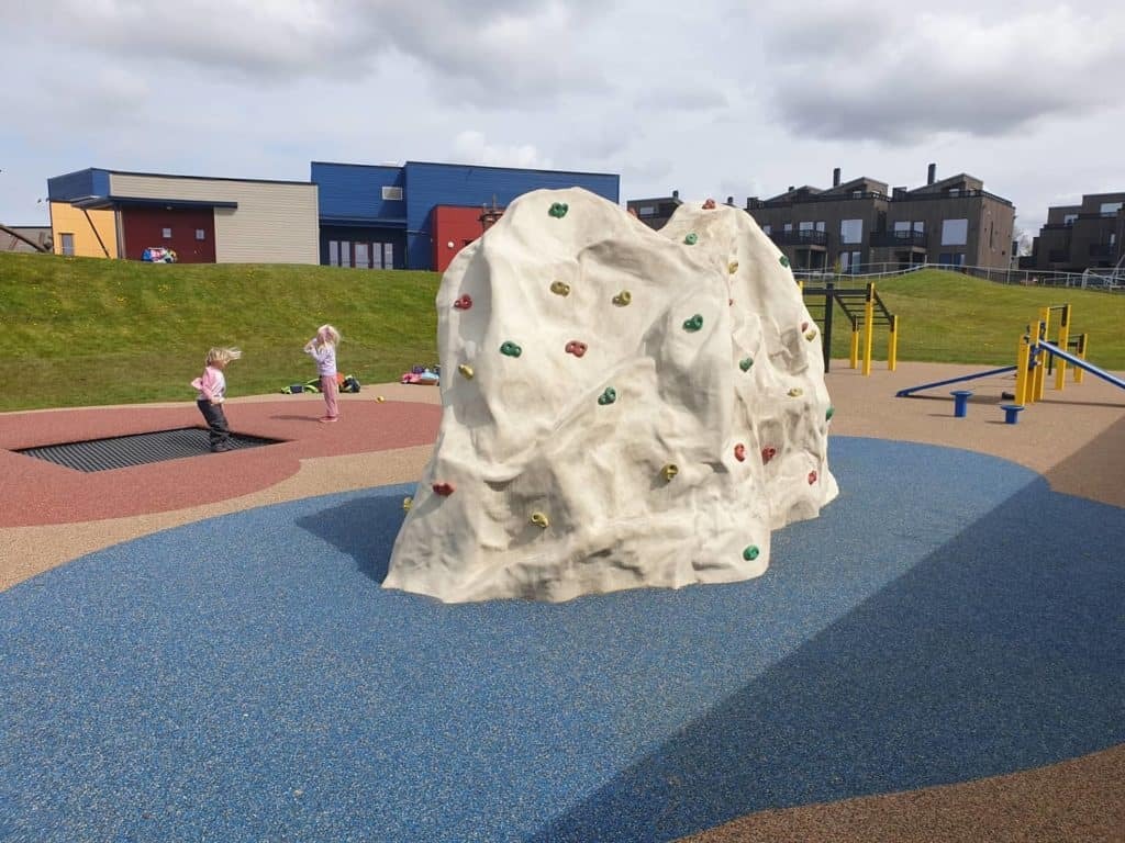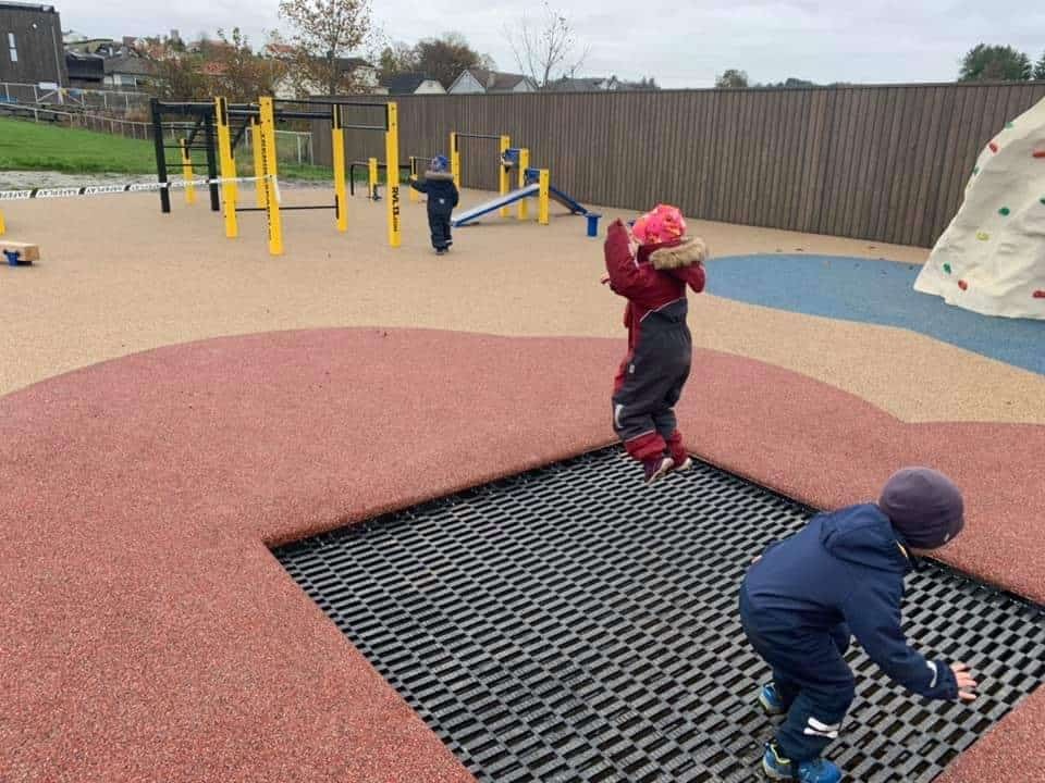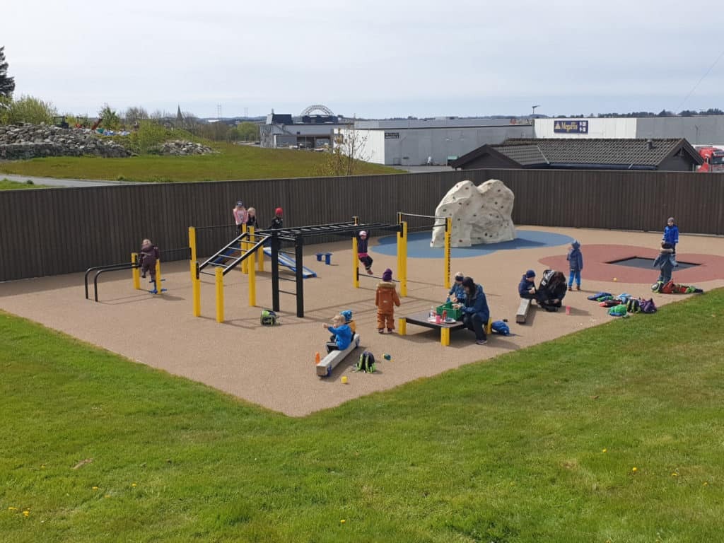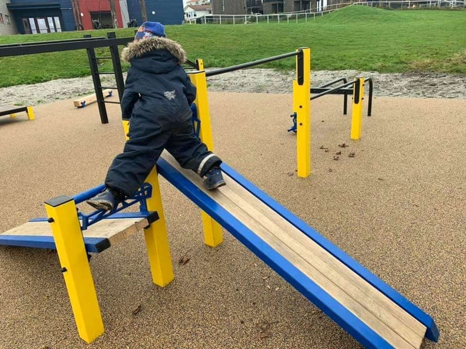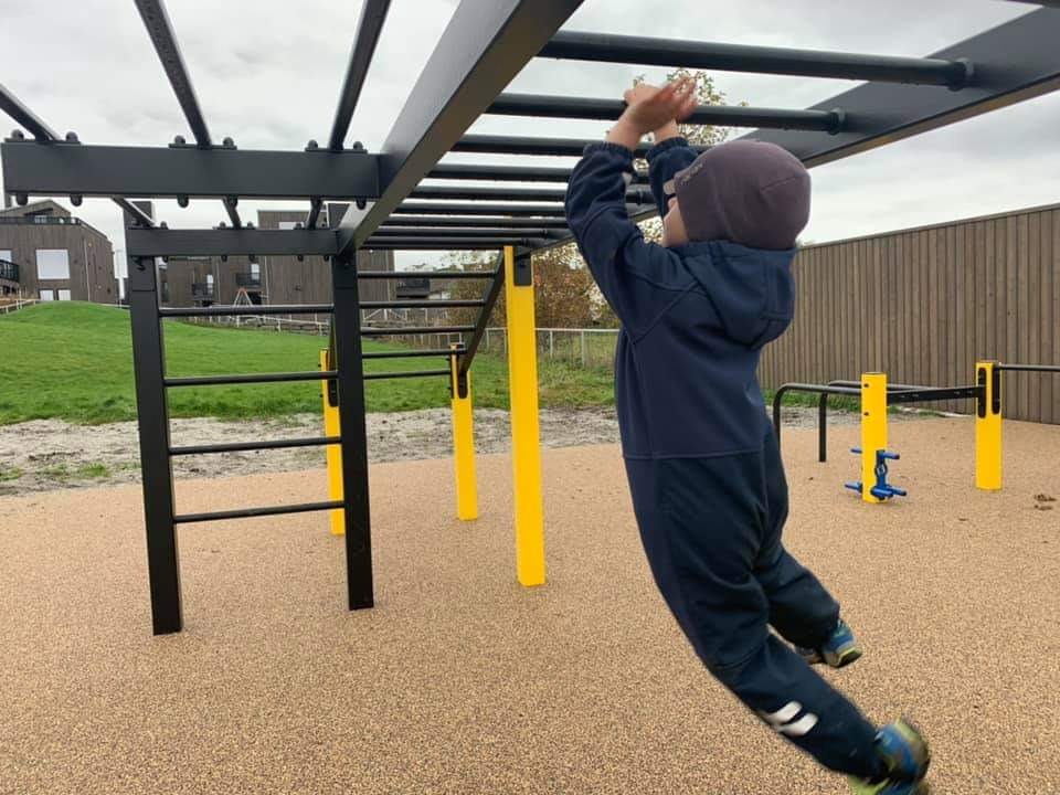 Her har vi designet verdens første treningspark for barn. Monkeybar er senket til max 1700mm, vi har og senket andre apparater for å tilpasse dem barna. I tillegg er det en trampoline og en flott buldrestein, denne kommer ferdig med grep montert på. Veldig enkel å få på plass.